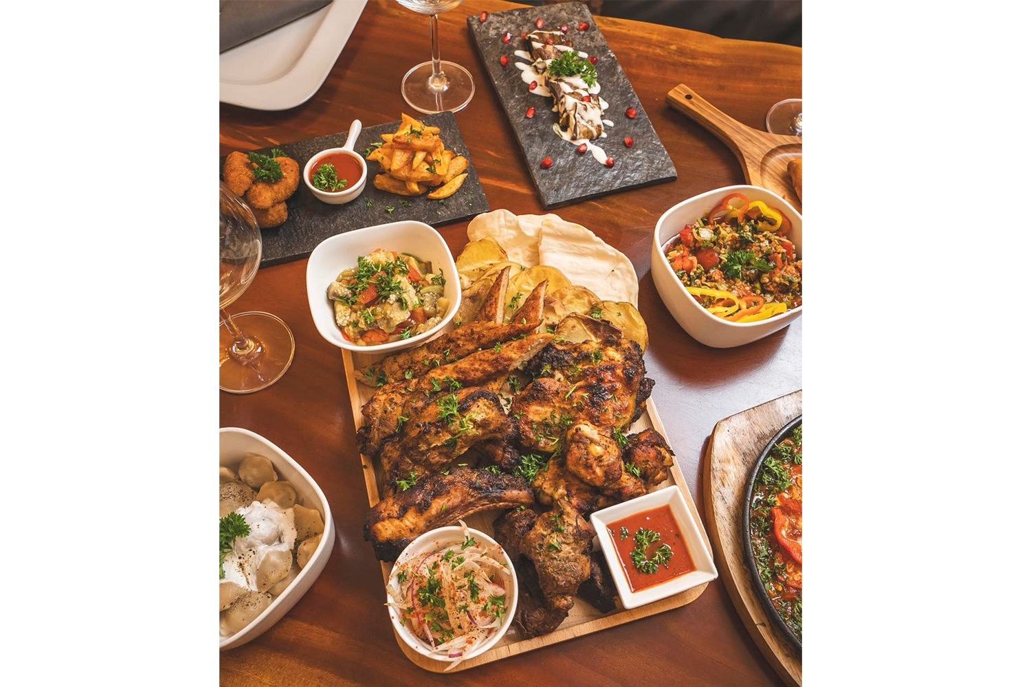 Սակայն այստեղ կա մի բան, որը ես շատ լավ եմ ճանաչում՝ լավ համեմված մսի բույրը։ Սեղանին առաջինը հայտնվեց հացը՝ ինչպես ընդունված է Հարավային Կովկասում, որտեղ այն խոհանոցի հիմքն է։ Մատնաքաշը հաստ է, ակոսավոր ու խմորոտ, իսկ լավաշը՝ բարակ, առանց ավելորդությունների։ Երկուսն էլ մատուցվում են զամբյուղով՝ թեթեւ ձաձիկիի, խիտ հումուսի, ծխահամ քեսաբի (kessab) եւ աջիկայի հետ, որն իմ նախընտրած մուգ կարմիր սոուսն է։
