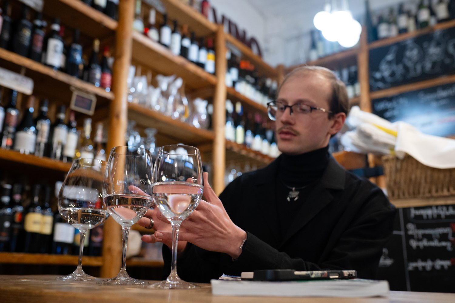 Էմիլը ոչ միայն հաճախորդների, այլեւ GastroVino-ի հետ է նույն պատրաստակամությամբ երկխոսության մեջ մտնում, երբ հետաքրքրվում եմ, թե In Vino-ի ամենատեսանելի հատվածում՝ վաճառասեղանի վրա, ինչո՞ւ է ջրով լցված գինու տարբեր երեք գավաթ դրված: